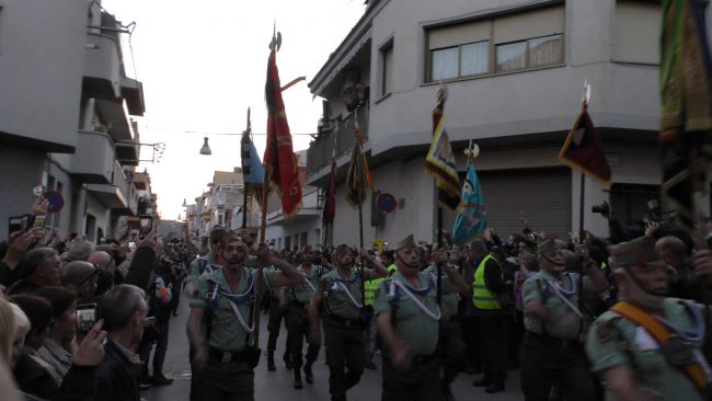 Y es que duraron poco los minutos de gloria del separatismo, el protagonismo cambió de repente de bando cuando la gente del Palafolls y vecinos venidos de toda parte de Cataluña empiecen a afluir hacía el punto de inicio de la procesión y el recorrido y empezaron los primeros vítores a favor de la unidad de España y de la Legión.