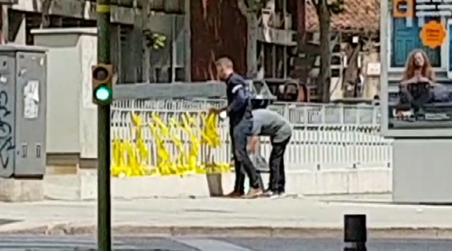 Redacción – No hay marcha atrás; los españoles empiezan a salir a la calle a plena luz del día para arrancar las propaganda racistas neonazi del independentismo del nuevo presidente de la Generalidad de Cataluña, Joaquim (Quim) Torra Pla. Y es que solo un desesperado «hombre mayor» independentista «nos llamaban bandidos de lazos amarillos»; ni olor de la juventud adoctrinada indepe. Tan solo dos españoles, entre ellos uno con una sola mano, han recuperado esta mañana la calle Sol y Padrís de Sabadell (Barcelona) con la Gran Vía de este municipio de la Comarca del Vallés Occidental. Sabadell (Barcelona) España, sábado 19 de mayo de 2018. Fotografía: SABADELL (ESPAÑA), 19.05.2018. En la imagen, los dos valientes españoles hoy en la calle So y Padrís de Sabadell esquina con Gran Vía de Sabadell actuando contra el neonazismo en esta parte hostil del territorio Nacional d ela Nación. En esta localidad, el destino de los vecinos españoles está en mano de un individuo de la CUP que se hace llamar Maties Serracant Camps; precisamente del partido local afines de la CUP ‘Crida per Sabadell’ (Llamada por Sabadell). Lasvocesdelpueblo