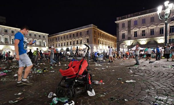 Efe – Una treintena de personas han resultado heridas este sábado como consecuencia de una estampida, provocada por una falsa alarma, que sembró el pánico en Turín donde estaban reunidos los aficionados del Juventus para ver el final de la Liga de Campeones contra el Real Madrid. Roma (Italia), sábado 3 de junio de 2017. Fotografía: A child’s stroller and strewn garbage is seen at San Carlos Square which was abandoned when football fans watching the UEFA Champions League final soccer match between Juventus FC and Real Madrid CF, fled the area in panic after reportedly false reports of a bomb in Turin, Italy, 03 June 2017. (Liga de Campeones, Italia) Efe.