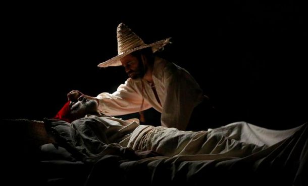 Efe – El IV centenario de la muerte de Cervantes acogió 491 proyectos en 2016. Las actividades previstas para la conmemoración proseguirán hasta el próximo 23 de abril, coincidiendo la fecha de la muerte del autor, si bien, la duración del programa de apoyo a través de los incentivos fiscales para los proyectos adscritos al Centenario culminarán el 30 de junio de 2017. Madrid (España), jueves 29 de diciembre de 2016. Fotografía: El actor español Marco Magoa y su colega tunecino Bechir Ghariani en una escena de «La soledad de Don Quijote«, obra representada dentro del «Festival de Cartago«, en el teatro Ibn Rachiq de Túnez. Archivo Efe.