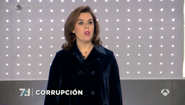 Agencias – Ana Pastor, la moderadora de 7 Debates Decisivos de Atresmedia (Antena 3) pregunta a Soraya Sáenz de Santamaría Antón, la candidata del Partido Popular -que substituyó al presidente del Gobierno y candidato del PP a la presidencia de España, Mariano Rajoy- «Ha habido responsabilidad políticas por los SMS de Rajoy a Bárcenas». Respuesta de Soraya: «Los responsables ya no están en mi partido». Uno de los autores sigue siendo el presidente del Partido Popular y candidato del PP a la presidencia del Gobierno de España, Mariano Rajoy Brey. Madrid, 7 de diciembre 2015. Fotografía: la candidato del PP, Soraya Sáenz de Santamaria Antón durante el Debate. Lasvocesdelpueblo.