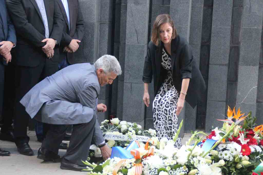FOTOGRAFÍA. BARCELONA (ESPAÑA), 19.06.2019. La Asociación Catalana de Víctimas de Organizaciones Terroristas (ACVOT), que preside José Vargas Rincón (i), moviliza a Policías nacionales, Guardias Civiles, Mozos de Escuadra, Policías Locales, partido políticos como VOX, representado por Ignacio Garriga Vaz de Concicao, al PP, representado por sus concejales en el Ayuntamiento de Barcelona, entre ellos Josep Bou Vila, a Ciudadanos (Cs), representado por sus cargos catalanes en el Ayuntamiento de Barcelona y su portavoz adjunto en el Congreso de los Diputados, Edmundo Bal Francés, y representante del Gobierno en funciones de España del presidente Pedro Sánchez (PSOE), representado por Sonia Ramos Piñeiro (d) quien es la directora de la Oficina de las Víctimas del Terrorismo en el Ministerio de Interior, hoy frente al Monumento de las víctimas del terrorismo, ubicado en la Avenida Rio de Janeiro, número 3 de Barcelona, para rechazar la masacre terrorista de los de Arnaldo Otegui Mondragón (EH Bildu). El PSC no ha asistido. Lasvocesdelpueblo (Ñ Pueblo)