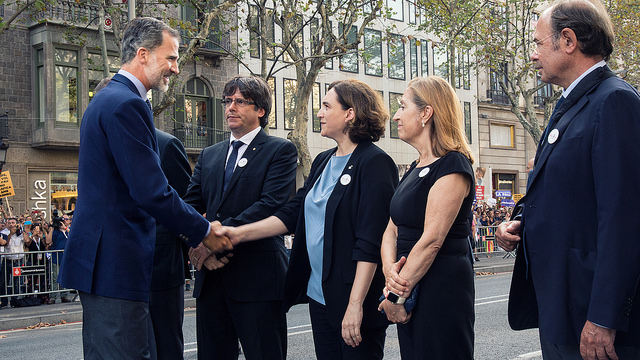 Redacción – El Gobierno municipal del Ayuntamiento de Barcelona de Ada Colau documenta e inicia la retirada de los espacios memoriales de las Ramblas para hacer una actuación patrimonial que recoja la reacción ciudadana a los atentados terroristas islamistas de Cataluña. Barcelona (España), lunes 28 de agosto de 2017. fotografía: Paseo de Gracia de Barcelona, sábado 26 de agosto de 2017. Manifestación bajo lema ‘No tengo Miedo’. El Rey de España (primer plano) saludo a la alcaldesa de Barcelona, Ada Colau, junto a su derecha, la presidenta del Congreso de los Diputados, Ana Pastor, y el presidente del Senado, Pío García-Escudero; y a su izquierda, el presidente d ela Generalidad de Cataluña, Carles Puigdemont. Fuentes Ayuntamiento de Barcelona/Lasvocesdelpueblo.