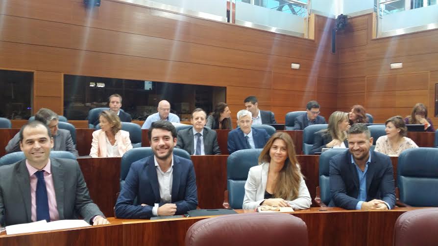 Redacción – El portavoz de la formación naranja española (CIUDADANOS), Ignacio Aguado, ha asegurado que su formación «sólo apoyará unos presupuestos» en la Comunidad de Madrid «que sean rigurosos, justos socialmente y cercanos a la realidad, no como los de 2015». Madrid, jueves 1 de octubre de 2015. <Fotografía: El líder de CIUDADANOS en la Asamblea de Madrid, Ignacio Aguado (i) juntos a su compañeros en el parlamento autonómico de Madrid>.