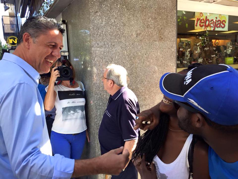 Lasvocesdelpueblo y Agencias – El candidato del Partido Popular en Cataluña al 27S, Xavier García Albiol, ha criticado que el gobierno autonómico de Artur Mas Gavarró utilice el fenómeno inmigratorio como un «instrumento» en favor del proceso separatista, así como que los manteros «campen a sus anchas» por la actitud «condescendiente» del gobierno de la Generalidad de Cataluña y del gobierno municipal del Ayuntamiento de Barcelona de la alcaldesa Ada Colau. El candidato del PP ha hecho estas declaraciones este viernes, 21 de agosto 2015, durante una entrevista a la agencia de noticias Efe. El candidato del partido de la gaviota quiere, ahora, que su partido trabaje también por las clases medias, «especialmente para las personas que peor lo están pasando», como por ejemplo la apertura de un comedor social «para personas sin recursos, fueran inmigrantes o españoles«, ha subrayado el candidato del PP al 27-s. <Fotografía: El candidato del PP al 27-2, Xavier García Albiol (izquierda), simpatizando con una pareja negra este miércoles en Salou (Tarragona). Foto Perfil Facebook/Xavier García Albiol>.