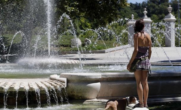 Efe – Entre 34 y 36 se alcanzarán en Zaragoza (Aragón), Cantabria, Lugo y Ourense (Galicia), La Rioja, así como Álava, Bizkaia y Gipuzkoa (País Vasco) y Navarra. El calor, entre los 34 y 38 grados, sitúa hoy en alerta amarilla a 25 provincias de once comunidades autónomas, informa la web de la Agencia Estatal de Meteorología (Aemet). Madrid (España), martes 23 de agosto de 2016. Fotografía: Un perro se refresca en las inmediaciones del parque de Madrid Río. Archivo Efe.