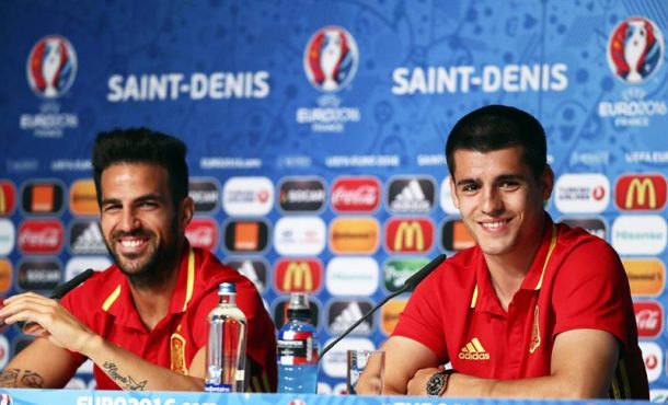 Lasvocesdelpueblo y Agencias – «Es difícil atacarle a Italia, son especialistas en defender y tácticamente son casi perfectos… Y hay que callarse (de cómo va a jugar España contra ellos)», prosiguió Morata, que insistió en que su rival trabaja «mucho» el aspecto táctico y advirtió contra la circunstancia de que ellos puedan adelantarse en el marcador. El internacional español lo decía este domingo 26 de junio 2016 en la rueda de prensa de la víspera en el estadio de Francia. París (Francia), lunes 27 de junio de 2016. Fotografía: Los españoles Cesc Fabregas (i) y Alvaro Morata (R) en la sala de prensa del Stade de France in Saint-Denis, Francia. Efe.