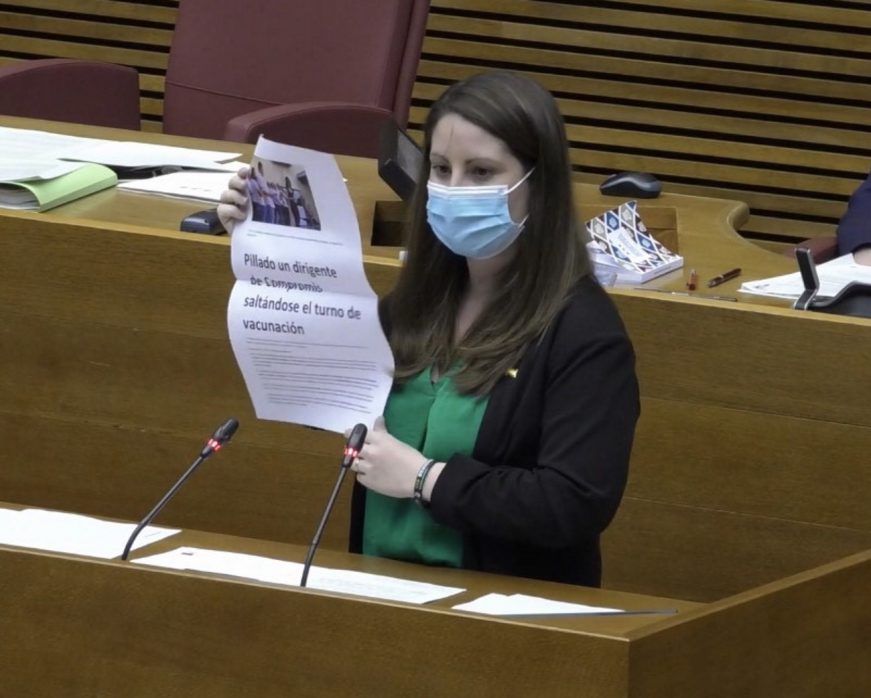 La portavoz de VOX ha afeado la actitud de un miembro de Compromis, pareja de la concejal de dependencia de la Pobla de Vallbona, que se saltó el turno de vacunación y que, presuntamente, habría utilizado su condición de cuidador no profesional de un familiar que había fallecido en enero. «Qué cara más dura, rastrero, inmoral y poco ético. Una auténtica vergüenza, señores de Compromís. ¿Cómo no vamos a votar a favor de esta comisión de investigación?».