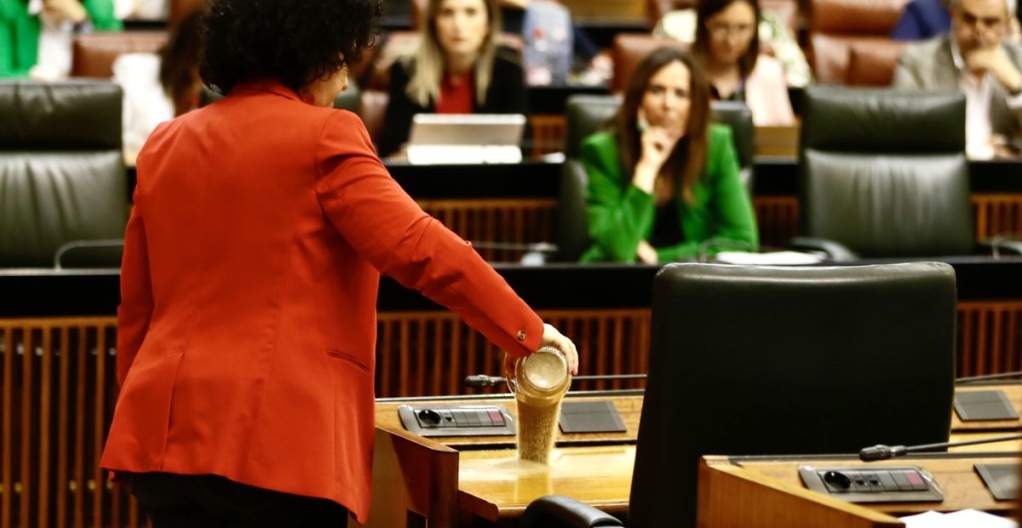 Sin la presencia del presidente en el debate, la diputada Mora ha denunciado que Moreno «lo que va hacer es secar» Doñana. Acto seguido ha abandonado el atril para dirigirse al escaño de Moreno, donde ha depositado el contenido de un vaso lleno de arena seca.