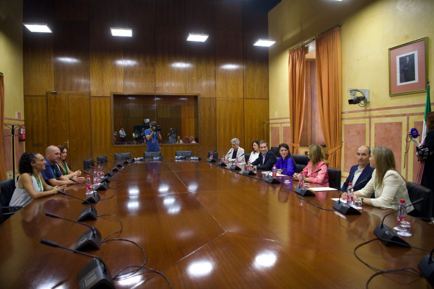 Redacción.- Sevilla, 5 de julio de 2022. La portavoz del Grupo Parlamentario VOX en en el Parlamento de Andalucía, Macarena Olona Choclán, acompañada del portavoz adjunto, Javier Cortés Lucena; la diputada por Sevilla, Ana Ruiz Vázquez; los diputados nacionales María de los Reyes Romero Vilches y Francisco José Contreras Peláez y por la concejal de VOX en el Ayuntamiento de Sevilla, María Cristina Peláez Izquierdo, se ha reunido con los presidentes de los comités de empresa de Abengoa.