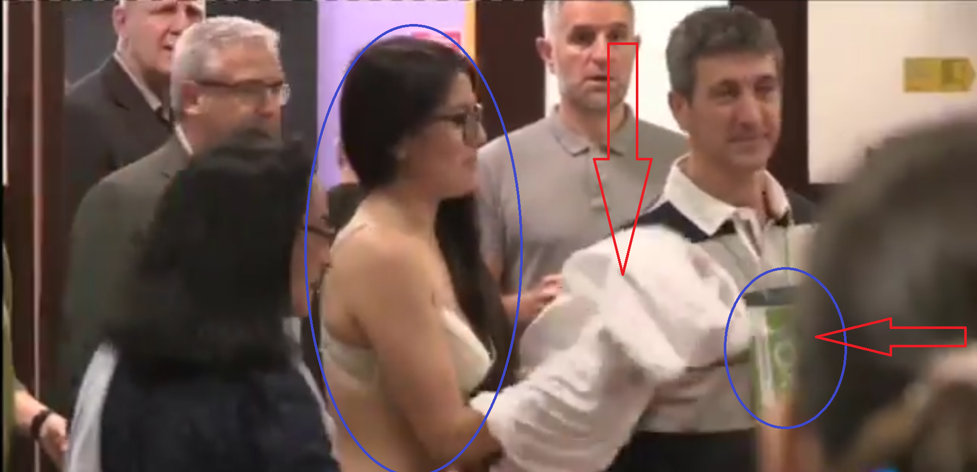 En respuesta, la mujer se ha quitado la camiseta en medio de la sala de votaciones para darle la vuelta y ponérsela del revés dejando a la vista su ropa interior, de manera que el lema quedaba disimulado.