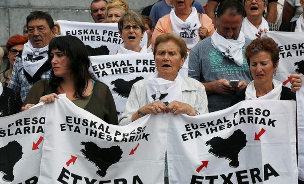 Redacción – La Asociación Plataforma de Apoyo a las Víctimas del Terrorismo (APAVT) ha presentado ante el Juzgado Central Decano de Instrucción de la Audiencia Nacional un escrito pidiendo la prohibición de las concentraciones convocadas para el próximo día sábado 10 de Diciembre de 2016 en Vitoria y Pamplona en las que se formarán cadenas humanas para pedir el fin de la dispersión de los presos de la banda terrorista conocida en lengua regional, euskera, como: Euskadi Ta Askatasuna, en español «País Vasco y Libertad» (ETA). Barcelona (España), jueves 8 de diciembre de 2016. Fotografía: En la imagen, un grupo de proetarras simpatizantes de Etxerat durante una concentración. Archivo Efe.