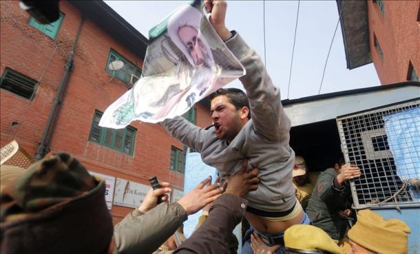 Efe – La Autoridad General de la Aviación Civil saudí anunció hoy la suspensión de todos los vuelos saudíes con destino y origen en Irán tras la decisión de Riad de romper las relaciones diplomáticas con Teherán, informó hoy la agencia oficial saudí de noticias, SPA. Las compañías nacionales tomarán las medidas necesarias para evitar que se perjudique a los viajeros que ya tienen reservados sus vuelos, añadió la agencia. Riad, 4 enero 2016. Fotografía: Un musulmán chií cachemiro corea consignas mientras es arrestado por la policía durante una manifestación convocada el domingo en Srinagar, capital de la Cachemira india. Efe.