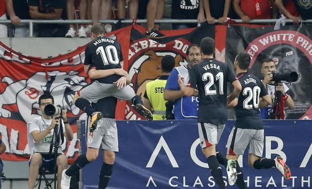 El conjunto rojiblanco se defendió con orden y sin apuros e incluso se desplegó con peligro, como en una buena combinación entre entre Susaeta y Aduriz que acabó con un entro al área del delantero rematado de cabeza fuera por poco por Raúl García.