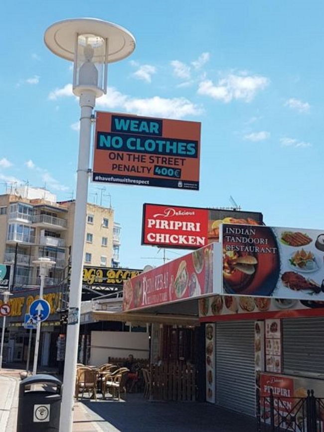 Efe – Otra de las claves, subraya el ayuntamiento, es destacar el importe de la sanción ya que es un recurso disuasorio ante la intención de cometer algún acto incívico. En 2017 el ayuntamiento interpuso 785 denuncias por consumo de alcohol en la calle y 68 por ir desnudo o semidesnudo en espacios no autorizados. Calviá (España), miércoles 20 de junio de 2018. Fotografía: CALVIÁ (ESPAÑA), 20.06.2018. Fotografía facilitada por el Ayuntamiento del Calviá de la campaña informativa que ha puesto en marcha en las localidades turísticas de Magaluf y Santa Ponça donde se advierte de que beber en la calle puede costar 500 euros de multa e ir desnudos 400. Efe.