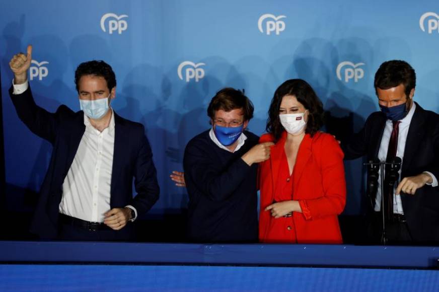 Los seguidores del PP han festejado en Génova un éxito contundente, donde, al 76,44 % escrutado, Ayuso dobla sus resultados de 30 a 64 escaños y en solitario se impone a la suma de PSOE (25), Más Madrid (24) y Unidas Podemos (10), por lo que sólo necesita la abstención de VOX para formar Gobierno.