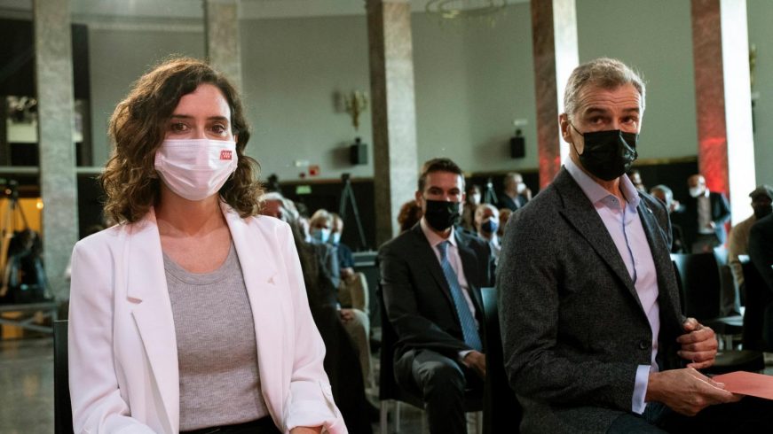 Efe.- Madrid (España), viernes 17 de septiembre de 2021. La presidenta de la Comunidad de Madrid, Isabel Díaz Ayuso, ha presentado este viernes la Oficina del Español, dirigida por Toni Cantó, un órgano que no pretende que Madrid sea la «cuna» del español o «disputar» con la Real Academia Española ni con el Instituto Cervantes.
