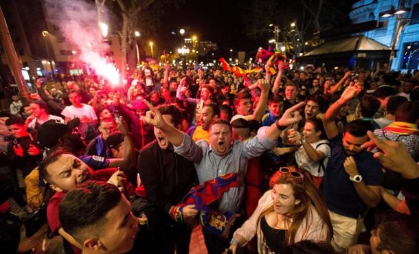 Lasvocesdelpueblo y Agencias – Los aficionados de FC Barcelon celebraron la final copera real sin los trapos con estrella del independentismo; muy pocas Estrelladas aparecieron anoche en la celebración culé. La celebración no fue tan multitudinaria como en otras ocasiones, igual porque los seguidores se han reservado para la próxima, la de la Liga, que el Barça podría conseguir el próximo fin de semana si gana en Riazor al Deportivo y hacer valer su gran ventaja al frente de la tabla clasificatoria. Barcelona (España), domingo 22 de abril de 2017. Fotografía: BARCELONA (ESPAÑA), 21.04.2018. Seguidores del FC Barcelona celebran la victoria del equipo blaugrana en la fuente de Canaletas, tras derrotar al Sevilla por 5-0 en la final de la Copa del Rey en el encuentro disputado en el estadio Wanda Metropolitano, en Madrid. Efe