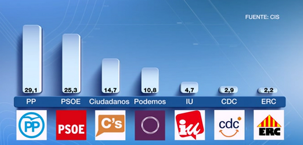 Lasvocesdelpueblo y RTVE – Según El Centro de Investigaciones Sociológicas (CIS) -un organismo autónomo español que depende del Ministerio de la Presidencia del Gobierno del partido Popular de Mariano Rajoy Brey, desde hace casi 4 años, y cuyo fin es el estudio científico de la sociedad española, normalmente a través de las realización de encuestas periódicas, por propia iniciativa del gobierno del PP de Rajoy o por petición de otras instituciones-, el Partido Popular (PP) de Mariano Rajoy Brey ha aumentado su distancia en voto con el PSOE (29,1% frente a 25,3%). Por su parte, la formación naranja española que lidera Albert Rivera Díaz, Ciudadanos (C’s) obtendría un (14,7%) adelantaría a la formación que lidera Pablo Iglesias: Podemos que obtendría solo un (10,8%) cayendo hasta cinco puntos respecto a julio. Finalmente, ahora el CIS dice que el líder del PSOE, Pedro Sánchez, aventaja al presidente del PP, Mariano Rajoy Brey, en su valoración como líder, aunque ambos suspenden. Barcelona, 5 de noviembre 2015.