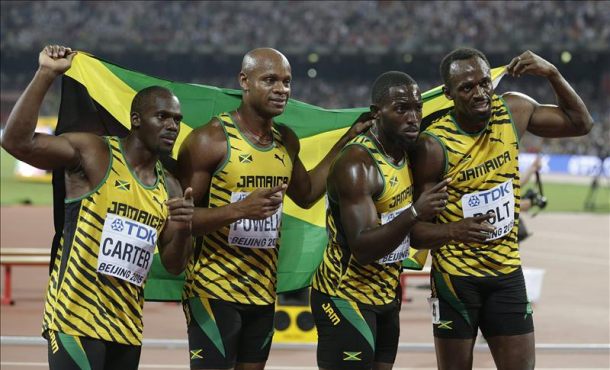 29 ago (EFE).- El nuevo récord mundial del estadounidense Ashton Eaton en decatlón (9.045 puntos, seis más que el suyo anterior) pasó casi inadvertido ante el revuelo que levanta Usain Bolt cada vez que comparece en El Nido, ahora para obtener su cuarto triplete en grandes campeonatos. Bolt, campeón individual de 100 y 200 metros, remató el triplete dorado en Pekín como último relevista del equipo de Jamaica, otra vez ganador, ahora con una marca de 37.36, frente a un cuarteto estadounidense que al final resultó descalificado. <Fotografía: Los jamaicanos Carter, Powell, Ashmeade y Bolt celebran la medalla de oro de los 4×100 relevos, dentro del Mundial de Atletismo, que se celebra en el estadio del Nido del Pájaro, en Pekín. Foto/Efe>.