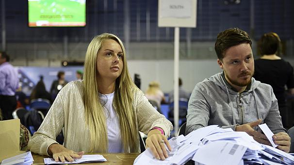Agencias – Primer sondeo tras el cierre de los centros de votación: la opción de permanecer en la Unión Europea ganaría el referéndum por cuatro puntos porcentuales, 52 % frente al 48 % de los votos, según una encuesta elaborada por la firma YouGov. La libra se dispara tras conocerse ese primer sondeo y cotiza a 1,493 dólares, frente a los 1,4875 antes del cierre de los colegios electorales. Es su cotización más elevada en todo el año 2016. Londres (Reino Unido), viernes 24 de junio de 2016. Fotografía: Dos personas contando los votos en un colegio electoral durante un recuento que durará casi toda la madrugada de este viernes 24 de junio 2016. Referéndum Brexit 52 por ciento a favor de permanecer en la UE, 4 por ciento a favor de salir, según un sondeo de YouGov. Lasvocesdelpueblo.