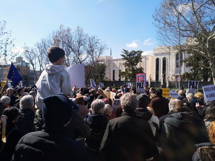 Efe.- Madrid (España), domingo 27 de febrero de 2022. Varios centenares de personas, 300 según la Delegación del Gobierno en Madrid, se han concentrado este domingo frente a la Embajada de Rusia para pedir el cese del conflicto armado entre ese país y Ucrania, en una manifestación convocada por la ONG Movimiento por la Paz, que ha transcurrido sin incidentes.