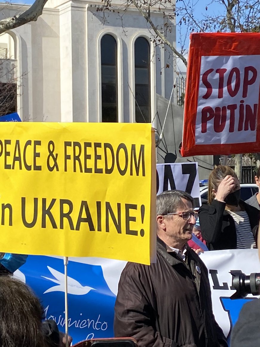 «En nombre de Movimiento por la Paz, estamos aquí en un acto cívico y pacifista de condena radical de la invasión rusa a Ucrania. La paz no es solo la ausencia de guerra. Estamos aquí para exigir la retirada inmediata de todas sus tropas de Ucrania», ha dicho Manuel de la Rocha, presidente de Movimiento por la Paz, ante los asistentes.