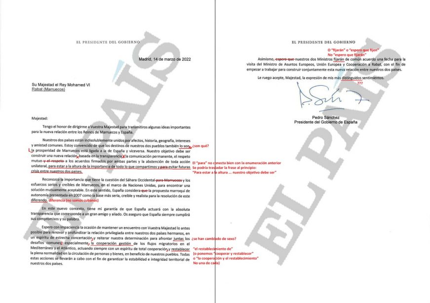 Redacción.- Barcelona (España), domingo, 3 de abril de 2022. La carta de Pedro Sánchez Pérez Castejón, secretario general del PSOE y presidente de Gobierno de España al Rey Mohamed VI de Marruecos. «El Presidente de Gobierno. Madrid, 14 de marzo de 2022. Su Majestad el Rey Mohamed VI, Rabat (Marruecos).