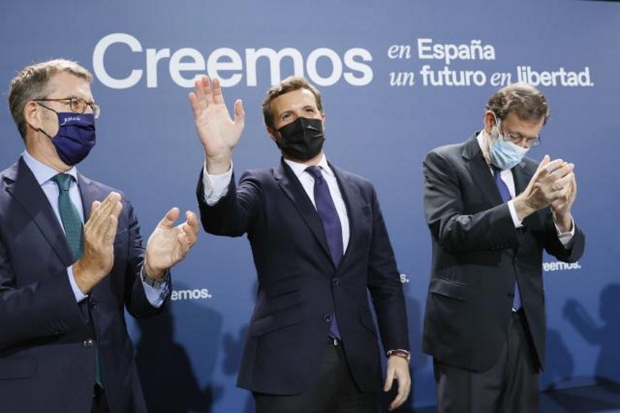 Efe.- Santiago (Galicia) España, lunes 27 de septiembre de 2021. El líder del PP, Pablo Casado, y el expresidente del Gobierno Mariano Rajoy han reivindicado al PP como la fuerza que ha salvado a España de las crisis que dejó el PSOE, la de los años 90, la de 2008 y a futuro: cuando los populares logren llegar a Moncloa tras la caída de la economía causada por la pandemia.