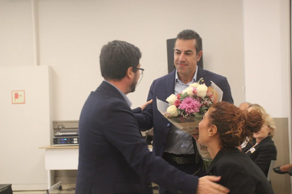 FOTOGRAFÍA. BARCELONA (ESPAÑA), 20 DE OCTUBRE DE 2023. En la imagen, agente del Cuerpo Nacional de Policía en las Unidades de Intervención Policial (UIP), que sobrevivió del infierno de las bandas organizadas de la esvástica amarilla, tras la publicación de la sentencia del golpe y que la gravedad de sus heridos le obligó a jubilarse, Álvaro González Burón (d), recibe su reconocimiento, en representación de todos sus compañeros, de la mano del del presidente de la entidad catalana Asociación por la Tolerancia (AT) e Ingeniero químico, C.B. (i). Cataluña rinde un histórico homenaje a los héroes del 1-O, elegido por un jurado de la Asociación por la Tolerancia 29° Premio a la Tolerancia, por defender la legalidad y la unidad nacional, plantando cara a las turbas y milicias del régimen de la esvástica amarilla por las calles de toda Cataluña el 1 de octubre de 2017, en marco de la llamada Operación Copérnico, autorizada por el Tribunal Superior de Justicia de Cataluña (TSJC), en cumplimiento de la sentencia del Tribunal Constitucional, para impedir el golpe de estado, con el que los fanáticos supremacistas querían convertir la mayoría de catalanes en extranjeros en su propio país, España. Lasvocesdelpueblo (Ñ Pueblo)