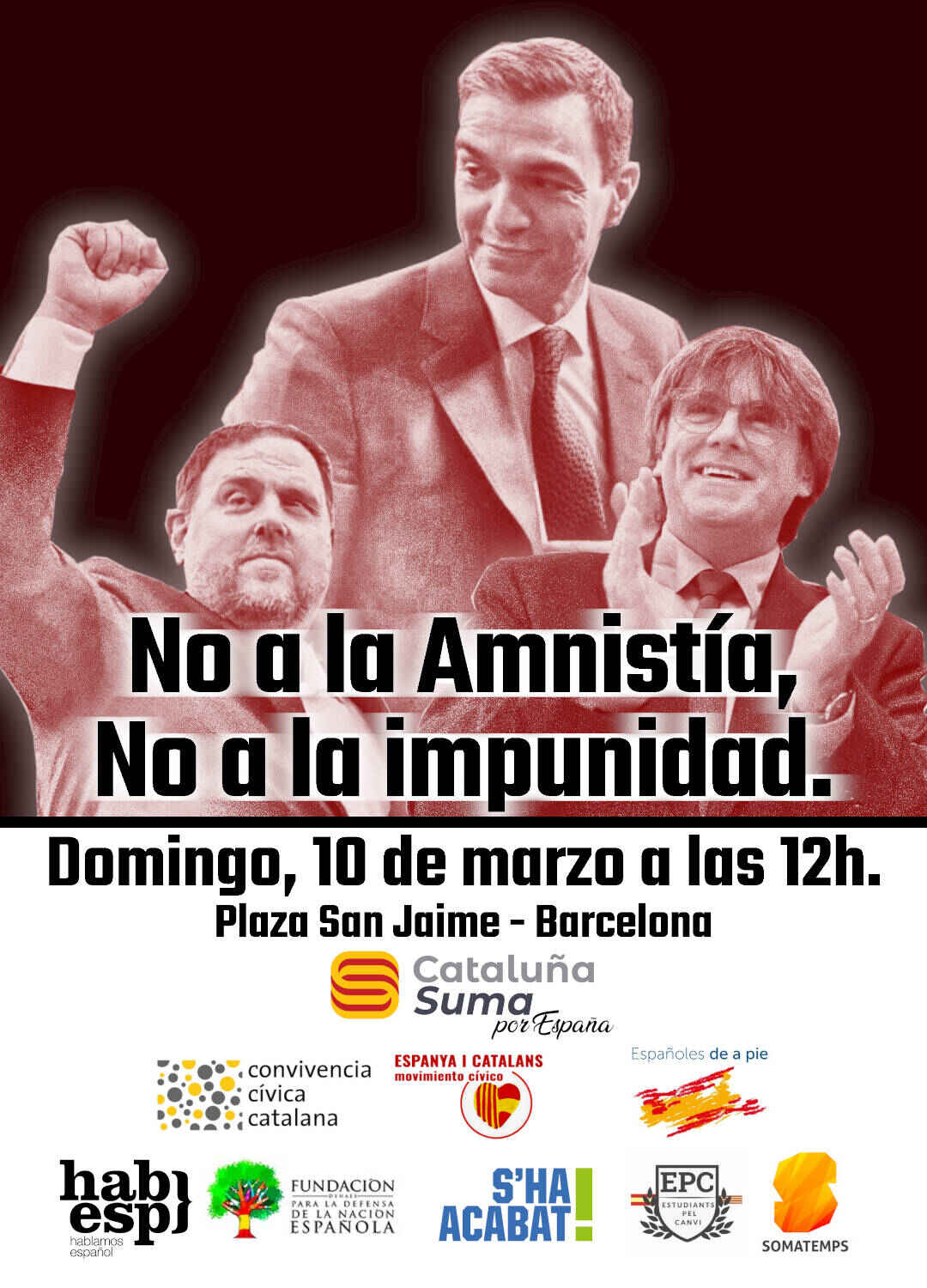 Los catalanes aseguran: «Este domingo 10 de marzo es necesario que te sumes a nuestra convocatoria en la Plaza de San Jaime de Barcelona a las 12 horas. Hemos de concentrarnos para decir ‘No a la amnistía y no a la impunidad'», afirman desde la plataforma catalana Cataluña suma por España, en un comunicado al diario digital Lasvocesdelpueblo.