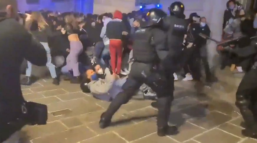 Redacción – La protesta pacífica ante los ataques contra las libertades fundamentales del pueblo —dictados por el Gobierno de coalición socialcomunista del presidente Pedro Sánchez (PSOE) y vicepresidente Pablo Iglesias (Podemos), con un estado de alarma de 6 meses, que las 17 Comunidades autónoma usan como excusa para aterrorizar al pueblo con sus campañas de miedo: toque de queda, confinamiento total, cierre perimetral, etc.; unas medidas ya fracasadas contra la pandemia del covid 19 tal y como se ha demostrado durante los meses de marzo, abril, mayo y junio de 2020 en la primera ola del coid 19 en España— han tenido esta tarde un primer «no» contundente del pueblo, a gritos de «libertad, libertad, libertad», mientras los agentes de la policía autonómica de Generalidad Cataluña Mozos de Escuadra han tenido que actuar a golpes de porras policiales para intentar expulsar a los manifestantes pacíficos de la Plaza San Jaime de Barcelona, donde varios manifestantes han desafiado a las amenazas y a los totalitarismos del vicepresidente del Gobierno nacionalsocialista en funciones de la Generalidad de Cataluña, Pere Aragonés (ERC), y a los de Sánchez y su vicepresidente Iglesias. Barcelona (España), viernes 30 de octubre de 2020.