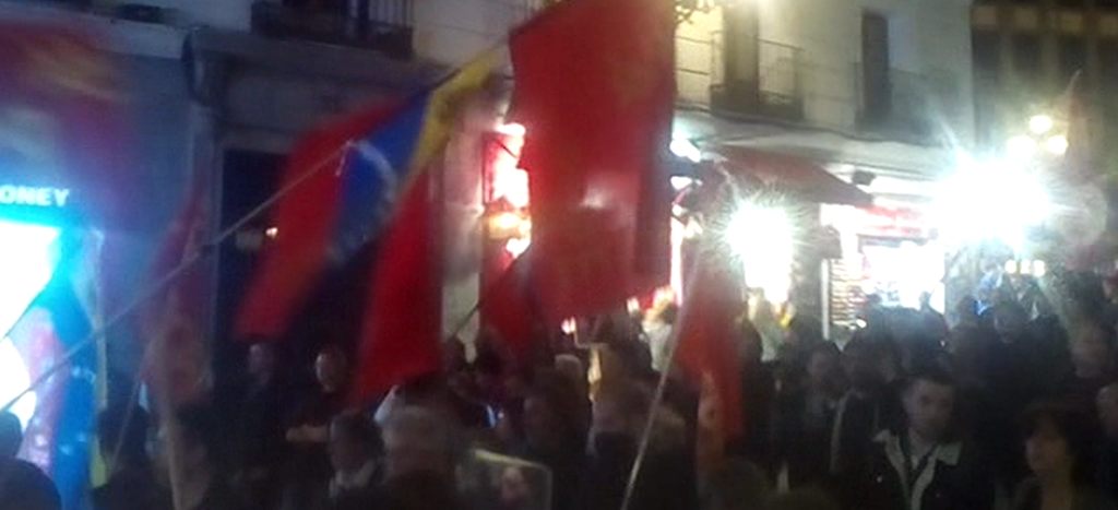 Redacción.- Madrid (España), viernes 1 de marzo de 2019. Una manifestación, orquestada por comunistas españoles, con servicio de orden encuadrado a los flancos con brazaletes rojos y banderas con la hoz y el martillo, recorrió anoche, jueves 28 de febrero de 2019, las calles de la capital de España a favor del chavismo en Venezuela.