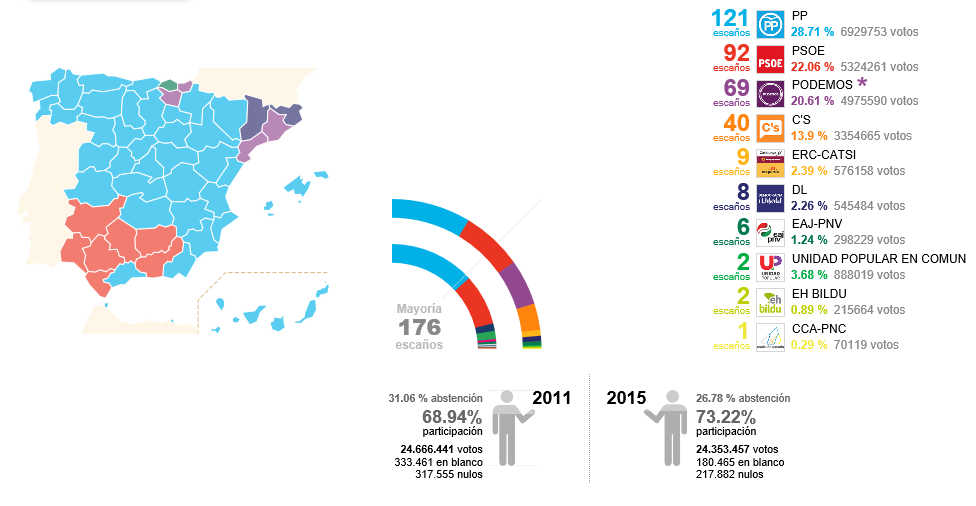 Agencias – Con el 93,29% de los votos escrutados, el PP pierde más de 4 millones de votos y el PSOE algo más de 1,8 millones. La vicepresidenta del Gobierno, Soraya Sáenz de Santamaría, y el ministro del Interior, Jorge Fernández Díaz, desgranan los resultados al 90% escrutado. Gana el PP, segundo sería el PP, tercero Podemos y cuarto, Ciudadanos. Datos oficiales: 90.39% escrutado. PP 122 , PSOE 91, POD 69, Cs 40.