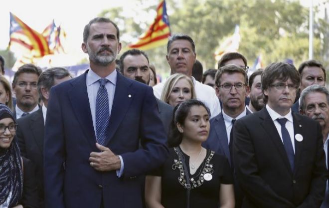 Redacción (Xavier Codorniu) – En breve se conmemorará el terrible atentado del 17 de agosto de 2017 que conmocionó a la opinión pública del mundo entero cuando el yihadismo segó la vida a un gran número de ciudadanos en la Rambla de Barcelona. Barcelona (España), lunes, 22 de julio de 2018. Fotografía: BARCELONA (ESPAÑA), 26.08.2017. Su majestad el rey Felipe VI (i) en la cabecera de la Manifestación de homenaje a las víctimas de los atentado yihadistas de Cataluña, hoy en las calles del centro de Barcelona. El fascismo, movilizado masivamente, ha abucheado al rey y le ha acusado de responsable de los atentados de Cataluña. A la derecha d ela imagen está el racista presidente de la Generalidad de Cataluña, Carles Puigdemont. Efe
