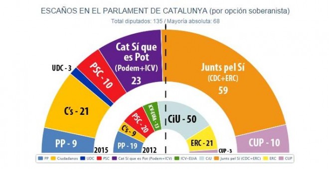 Es decir, si en el Parlamento se supera la mayoría absoluta de diputados por la independencia de Catalunya será por el crecimiento de la CUP, más que triplicando sus escaños (de 3 a 10), gracias a su implantación en localidades pequeñas donde el valor relativo de los votos es superior a los de las grandes urbes. En cambio, la lista de Mas y Junqueras (por mucho que esté encabezada por el exeurodiputado de ICV Raül Romeva) se queda por sí sola bien lejos de esa mayoría absoluta (68 escaños) que reclama la dirigente de la ANC y número 2 de la candidatura, Carme Forcadell.
