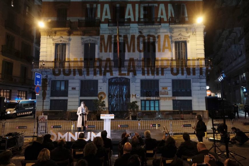 Ha ocurrido a vísperas 46 aniversario de la muerte del generalísimo caudillo de España, Francisco Franco Bahamonde. «46 años después de la muerte del dictador, la comandancia de Via Laietana es hoy una señal inequívoca de la represión que continúa». «Ni un solo euro público en la comisaría de Via Laietana, si no es para convertirla en un centro de memoria y dignidad colectiva», manifestó el golpista Cuixart durante su discurso, mientras su entidad ha tachado de «anomalía democrática» la existencia de una «comisaría» de Policía Nacional en Barcelona, precisamente la Jefatura Superior de Policía Nacional de la Vía Layetana de la Ciudad de Barcelona.