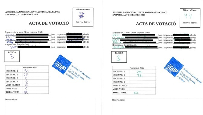 Agencias – La CUP ha difundido las actas del escrutinio de su asamblea extraordinaria del domingo 27 de diciembre 2015 en Sabadell (Barcelona), que terminó con el insólito empate -considerado como un «pucherazo«- entre los partidarios y detractores de invertir Artur Mas Gavarró, el candidato de Juntos Por El Sí (JxSí) desde el 27 de septiembre 2015 y presidente en funciones de Cataluña. Ahora, se sabe que hubo también «1 voto nulo y 12 votos en blanco». Barcelona, 31 de diciembre 2015. Fotografía: Las catas facilitadas por candidatura de unidad Popular-Crida Constituyente (CUP-CC).