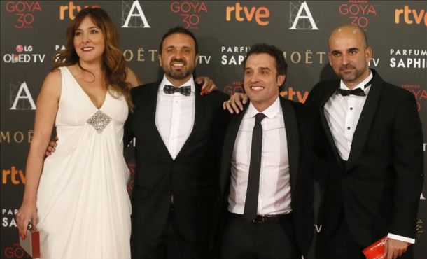 Agencias – Tras recibir el premio a mejor director novel, ha asegurado que el Goya se lo va a regalar a su abuela. «Es de ella», ha dicho. Daniel Guzmán (Madrid, 1973) ha ganado el Goya a la mejor dirección novel con «A cambio de nada», un retrato en parte autobiográfico de un adolescente de extrarradio. Madrid, 6 febrero 2016. Fotografía: El director Daniel Guzmán (2d) y el equipo de «A cambio de nada» a la ceremonia de la 30 edición de los Premios Goya, que entrega la Academia de Cine, celebrada esta noche en el Hotel Auditorium de Madrid. Efe.
