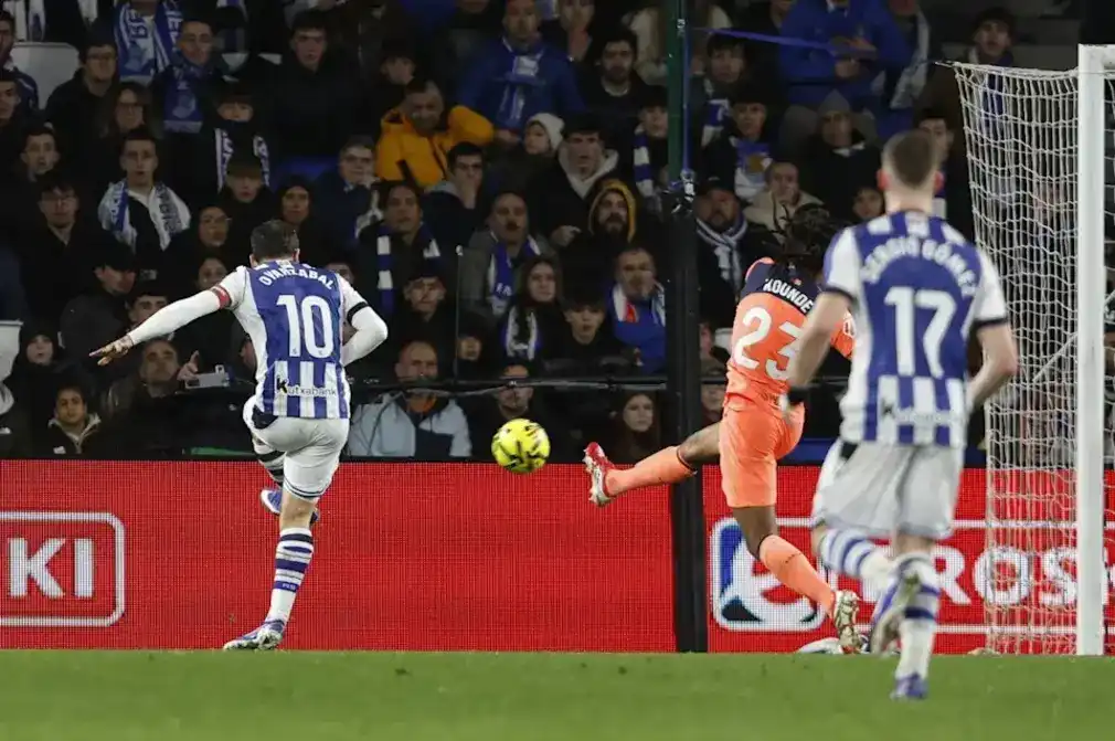 La Real Sociedad, gracias a los goles de Mikel Oyarzabal y Gonçalo Guedes, doblegó este domingo por (2-1) al Barcelona en un encuentro loco en el que el árbitro anuló hasta cuatro goles y un penalti y el equipo azulgrana estrelló cuatro balones en la madera para ver su ventaja sobre el Real Madrid reducida a un solo punto.