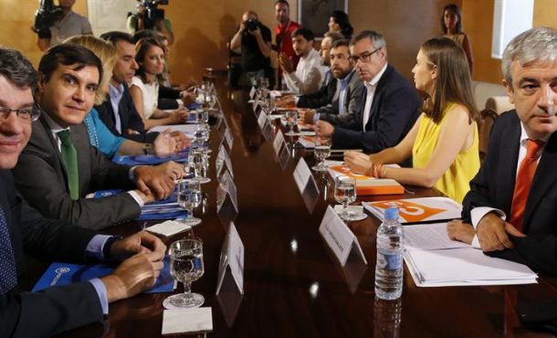 Efe – El PP: «No hemos dicho no a nada, hemos hablado de tratar de buscar posiciones intermedias en las que podemos encontrarnos«, ha dicho Ayllón, quien ha asegurado que su partido tiene la misma voluntad con la que comenzó estas negociaciones, que es la de lograr un acuerdo que haga posible la formación de gobierno. El PP ha respondido este miércoles 24 de agosto de 2016 por la tarde a las advertencias de Ciudadanos sobre el estancamiento en las negociaciones entre ambos partidos al subrayar que no está «preocupado» por este proceso sino «ocupado» en «acercar posturas y buscar el mayor nivel de acuerdo en todas las materias». Madrid (España), jueves 25 de agosto de 2016. Fotografía: Los integrantes del equipo negociador del PP, Álvaro Nadal, José Luis Ayllón, Fátima Báñez, Fernando Martínez-Maillo, Andrea Levy, José Antonio Bermúdez de Castro y Dolors Montserrat (i-d), y de Ciudadanos Luis Garicano, Melisa Rodríguez, José Manuel Villegas, Miguel Gutierrez, Juan Carlos Girauta y Toni Roldán (d-i), durante la nueva reunión que mantuvieron hoy en el Congreso. Efe.