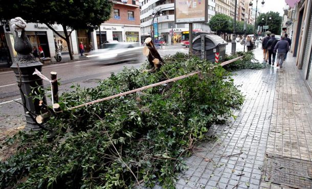 Efe – El temporal causa dos muertos y persiste mañana en Cataluña y Baleares. El temporal de lluvia y viento que afecta desde el pasado viernes al sureste peninsular y Baleares y que ha causado dos muertes, cuantiosos daños, desbordamiento de ríos, cortes de carreteras y cierres de colegios y hospitales comienza a remitir mañana en el sureste, pero persiste en Cataluña y Baleares. Madrid (España), lunes 19 de diciembre de 2016. Fotografía: La caída de un árbol y una farola, como consecuencia de las lluvias y el viento, ha obligado ha cortar varios carriles de la calle Colón de Valencia. Efe.