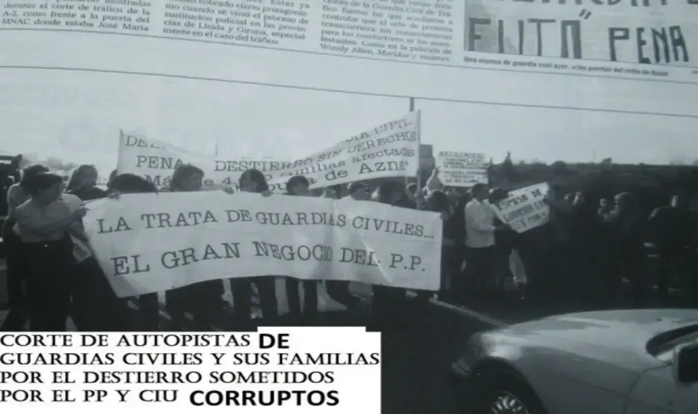 - La trata de los guardias civiles; el gran negocio del PP. Los guardias civiles y sus familias cortan autopistas en Cataluña por el destierro al que están siendo sometidos por parte de las formaciones políticas corruptas: Partido Popular (PP) y Convergencia i Unió (CiU) [verse foto adjunta]