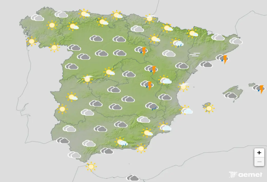 Madrid (España), domingo 8 de marzo de 2026 (Lasvocesdelpueblo).- EL TIEMPO ESPAÑA | La Agencia Estatal de Meteorología (Aemet) prevé un domingo de lluvias y cielos nubosos o cubiertos con fenómenos significativos: probables precipitaciones localmente fuertes y con abundantes acumulados en el nordeste y sudeste peninsular y probable ascenso localmente notable de las temperaturas máximas en zonas occidentales del Cantábrico.