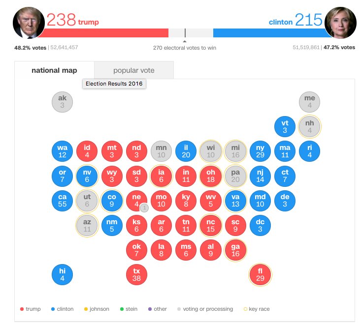 Lasvocesdelpueblo y Agencias – Resultados actualizados delas elecciones estadounidenses 2016. Trump se lleva todos los estados en disputa con Clinton: Trump suma 238 votos del colegio electoral y Clinton lleva 215. Donald Trump está casi en las puertas de la Casa Blanca. El republicano gana en las mayoría de los estados claves en las elecciones presidenciales 2016 de Estados Unidos de América. Washington (Estados Unidos), miércoles 9 de noviembre de 2016. Fotografía: Mapa actual de la votación. Donal Trump gana en las mayoría de Estados y ya está casi en las puertas de la Casa Blanca, imagen de CNN. Lasvocesdelpueblo.