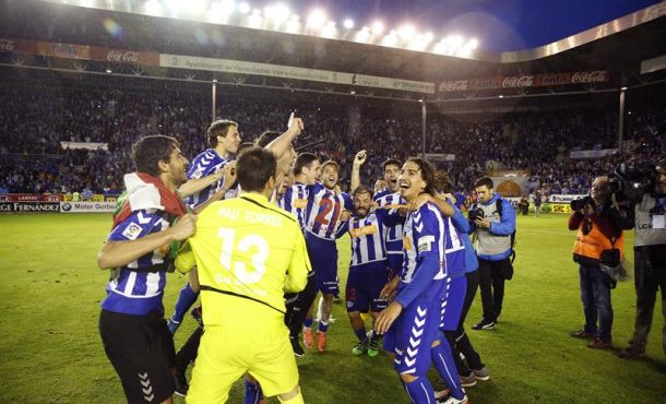 Los goles de Manu García, que abrió el marcador para los vitorianos a los 23 minutos, y de Raúl García, que firmó el definitivo 2-0 a los 41, permitieron a los de Pepe Bordalás lograr el triunfo que necesitaban para regresar a la Liga profesional española de primera división. Un ascenso que se jugarán el próximo sábado el Leganés, que se impuso hoy por 2-0 al Llagostera, y el Gimnàstic de Tarragona, que venció por 0-3 al Lugo, en una última jornada en la que los madrileños visitarán el campo del Mirandés y los catalanes recibirán al Alavés.