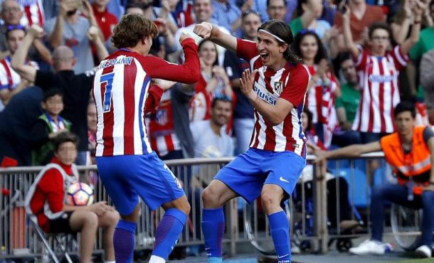 Efe – (3-0). El Atlético llegó a fallar dos penaltis en pocos minutos, lanzados por Carrasco y el ghanés Thomas Partey, ambos parados por el portero italiano Salvatore Sirigu; en un partido en el que retornaron a los terrenos de juego el portugués Tiago Mendes, después de cuatro meses de lesión y el italiano Alessio Cerci, que no había debutado en LaLiga en la presente temporada. Madrid (España), sábado 15 de abril de 2017. Fotografía: El defensa brasileño del Atlético de Madrid Filipe Luis Kasmirski (d) celebra con su compañero, el francés Antoine Griezmann, su gol ante el Osasuna, el tercero del equipo, durante el partido de Liga en Primera División en el estadio Vicente Calderón, en Madrid. Efe.