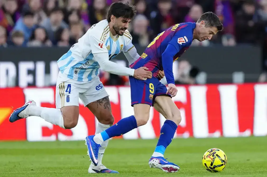 Dos errores defensivos del Oviedo en cinco minutos encarrilaron la victoria local. El 1-0 llegó tras una presión de Lamine y un remate cruzado de Olmo (min. 52), el 2-0 tras un error de David Costas que aprovechó Raphinha con una ‘delicatessen’ de vaselina en el 57.