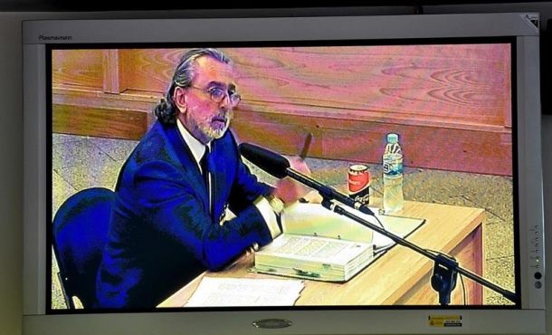 Lasvocesdelpueblo y rtve – [Vídeo de la confesión del cabecilla del Gürtel ante el Tribunal del Caso de la Trama Gürtel]. También ha confesado el pago de dádivas y regalos a diferentes políticos de este Partido Popular (PP) de Mariano Rajoy Brey, partido del gobierno en funciones del Reino de España. El cabecilla de Gürtel sigue declarando tras un interrogatorio de siete horas. Niega que las iniciales P.A.C de su caja B sean de Francisco Álvarez Cascos. Reconoció haber entregado comisiones del 3% a Bárcenas por adjudicaciones. Madrid (España), viernes 14 de octubre de 2016. Fotografía: Imagen del monitor de la sala de prensa de la Audiencia Nacional en San Fernando de Henares del presunto cabecilla de la trama Gürtel, Francisco Correa, durante su declaración en el macrojuicio por la trama de corrupción. Efe.