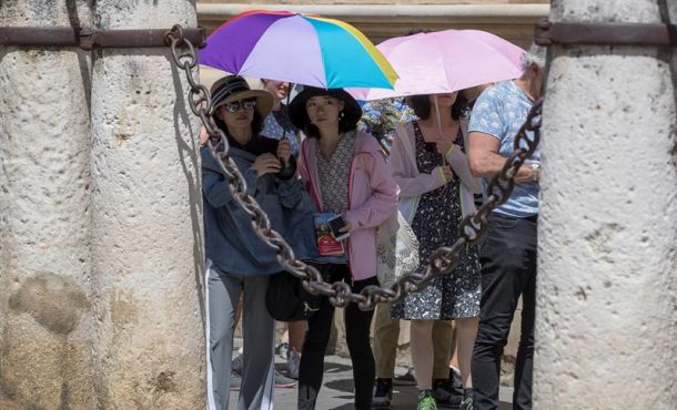 Efe – El intenso calor continúa y mantiene en alerta a veintiocho provincias de doce comunidades, tres de ellas en alerta naranja por máximas entre los 39 y 40 grados, informa la Agencia Estatal de Meteorología (AEMET) en su página web. Madrid (España), jueves 22 de junio de 2017. Fotografía: Verano 2017., jueves 22 de junio de 2017. Unas turistas guardan cola para acceder a la Catedral de Sevilla protegiéndose del sol con sombrillas para mitigar las altas temperaturas, por encima de 40 grados. Efe.